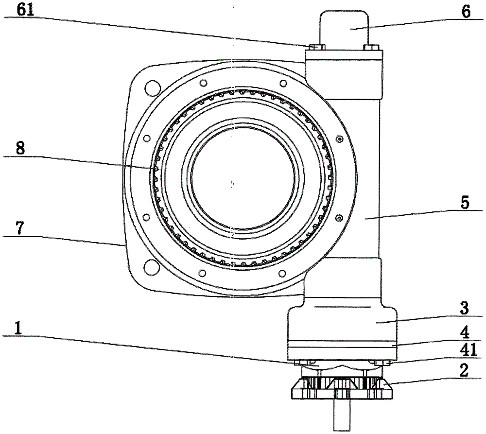 附图标记说明:星型齿轮下箱体1、油封箱体2、星型齿轮上箱体3、齿圈4、蜗杆箱体5、调节箱盖6、涡轮箱体7、圆形全齿涡轮8、阀门轴孔9、第一紧固螺栓41、第一o形圈42、第二紧固螺栓51、第二o形圈52、第三紧固螺栓61、第三o形圈62、主壳体71、涡轮壳体72、轴孔壳体73、第四紧固螺栓721。
